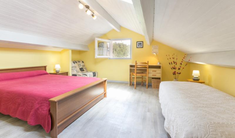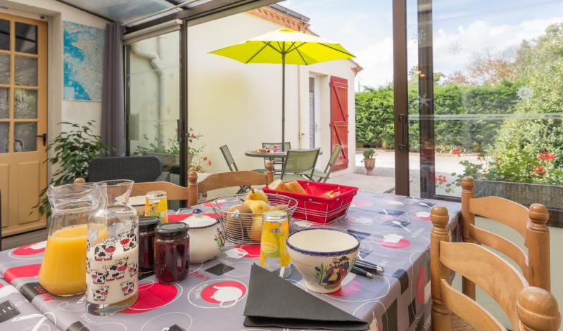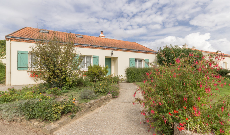Dans le calme de la campagne, à quelques minutes de la côte et de ses plages, maison traditionnelle avec un grand espace extérieur dont un jardin non-clos de 400 m² avec terrasse, barbecue, salon de jardin. 4 chambres en r.d.c (1: lit 140x190, 2: 2 lits 90x190 + convertible / accès hand., 3: lit 140x190 + convertible, 4: 2 lits 90x190) et 1 mansardée à l'étage accessible par escalier un peu difficile (1 lit 140x190), chacune avec s.d.e/wc privatifs. Coin cuisine et véranda à disposition. Equip. suppl.: s-cheveux, accès Wifi, équip. complet bébé. Taxe de séjour en plus. Pornic à 10 km. Le plus: chemin de randonnée derrière la maison.